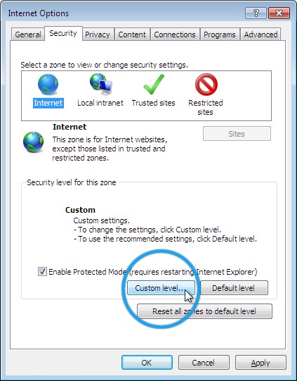 Enabling or disabling JavaScript in Internet Explorer involves setting a custom security level; so click the button to modify it.