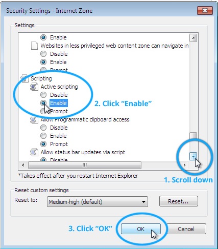 Scroll down to the section titled "Scripting". There is a sub-section called "Active scripting". Click the option "Enable" to enable Javascript. Press the "OK" button to save this change.