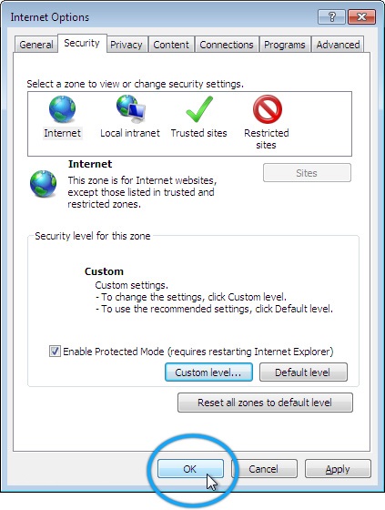Enabling or disabling JavaScript in Internet Explorer involves setting a custom security level; so click the button to modify it.